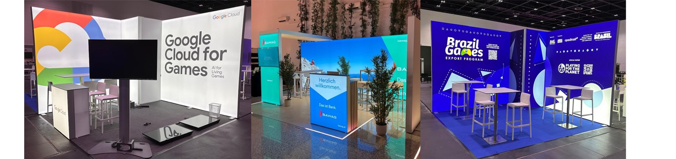 以下は弊社が自社出展した時のブースです。専用キャリーケースと脚立をハイエースに全て積み込み3名で施工と撤去を行いました。