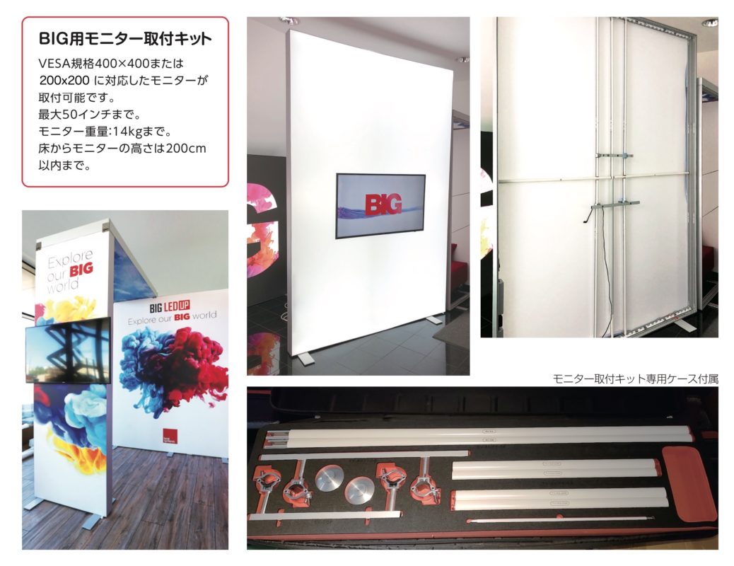 もう1つの大きな特徴として、豊富なアクセサリーパーツがあります。最大50インチ(重量14kgまで)のモニターもファブリックコルトンの上に取り付け可能になりますので、ご利用時に動画を流したい場合には別途モニター台などを準備せずともアテンションアップが期待できます。